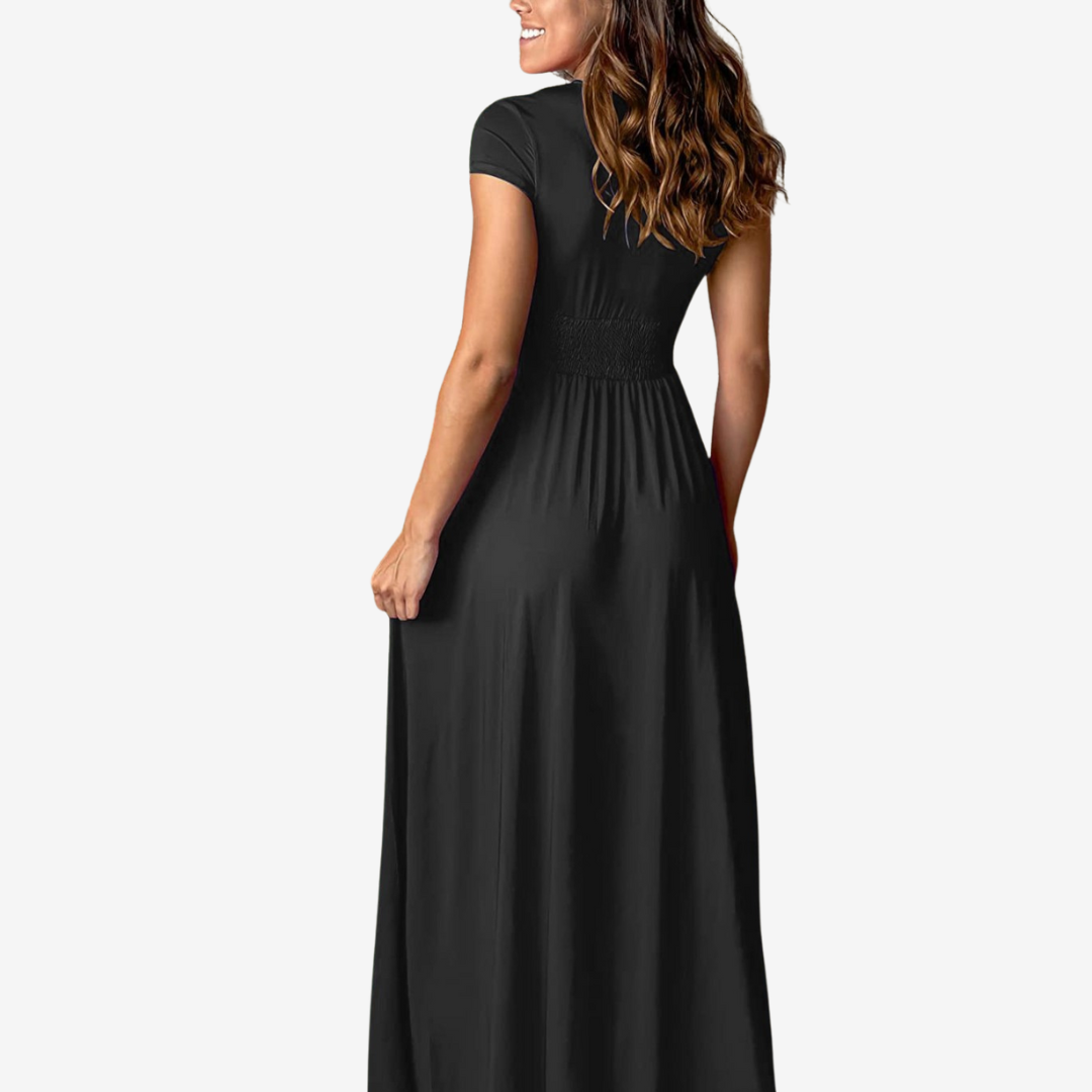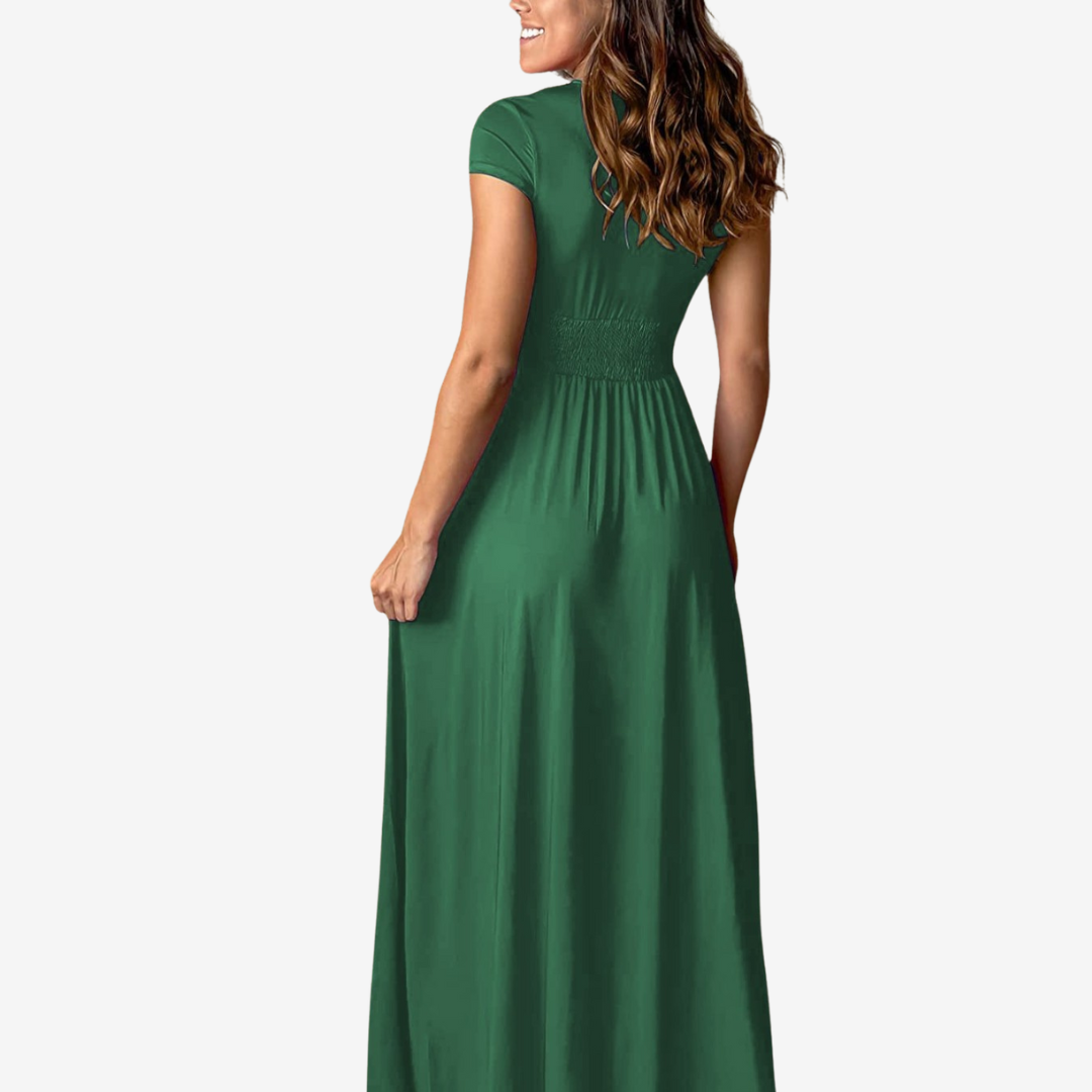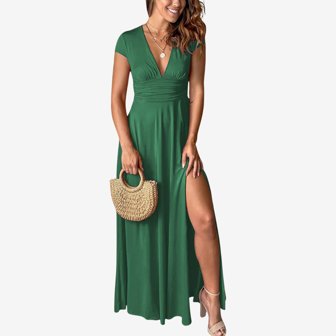 L'abito lungo avvolgente Cléa™ sfoggia un fascino aggraziato con la sua profonda scollatura a V, le sottili maniche ad aletta e l'ampio spacco laterale. Realizzato in morbido jersey elasticizzato, avvolge la vita prima di scivolare in una silhouette lusinghiera, perfetto per matrimoni, cocktail hour o serate autunnali.