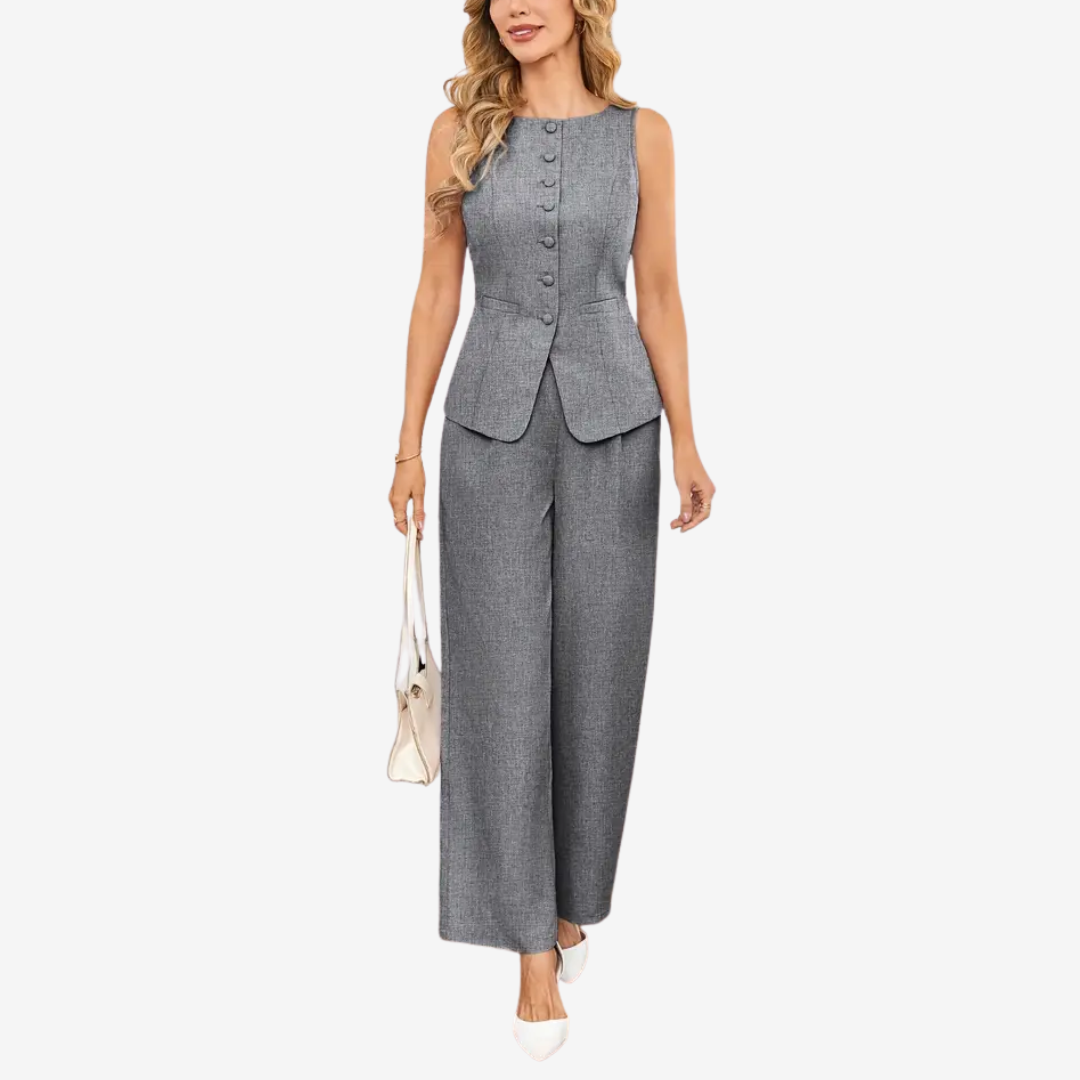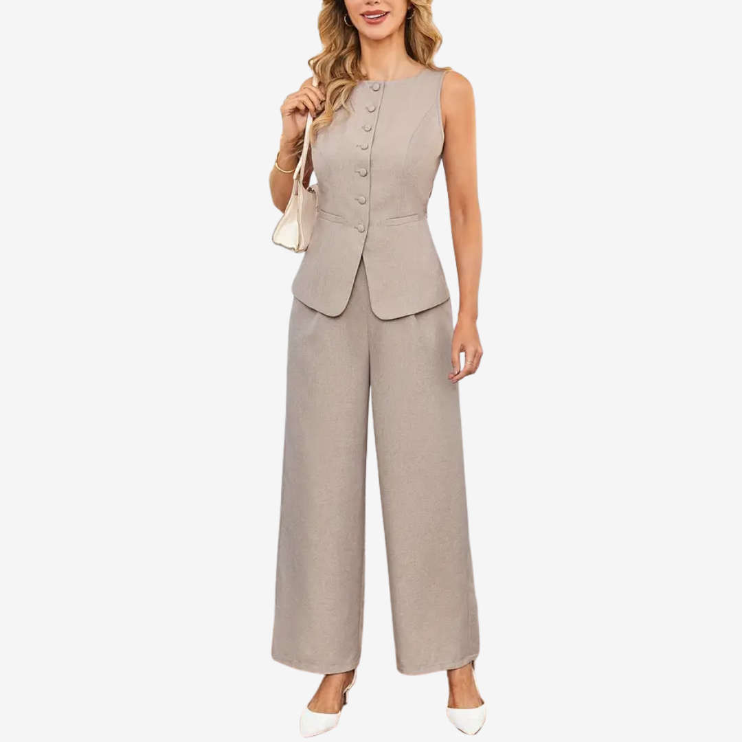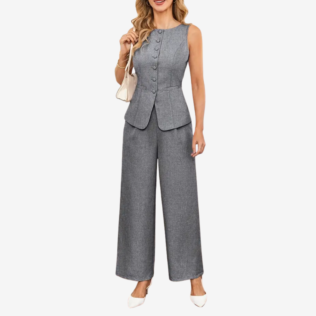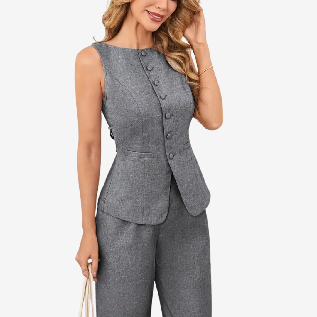 Arricchisci il tuo guardaroba con Aurélie™, un raffinato tailleur due pezzi pensato per le donne moderne che apprezzano struttura, stile e morbidezza. Questo completo è caratterizzato da un esclusivo gilet asimmetrico con bottoni, vita scolpita e taglio senza maniche che valorizza le spalle. Abbinato a pantaloni a gamba larga e vita alta, dalla vestibilità fluida ed elegante, si adatta con disinvoltura alla tua giornata e al tuo umore.