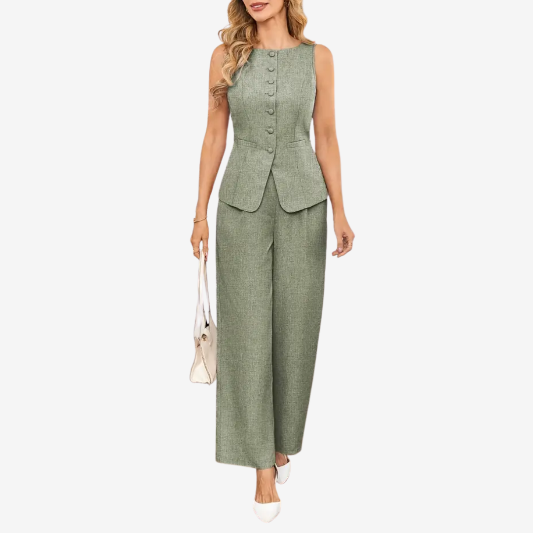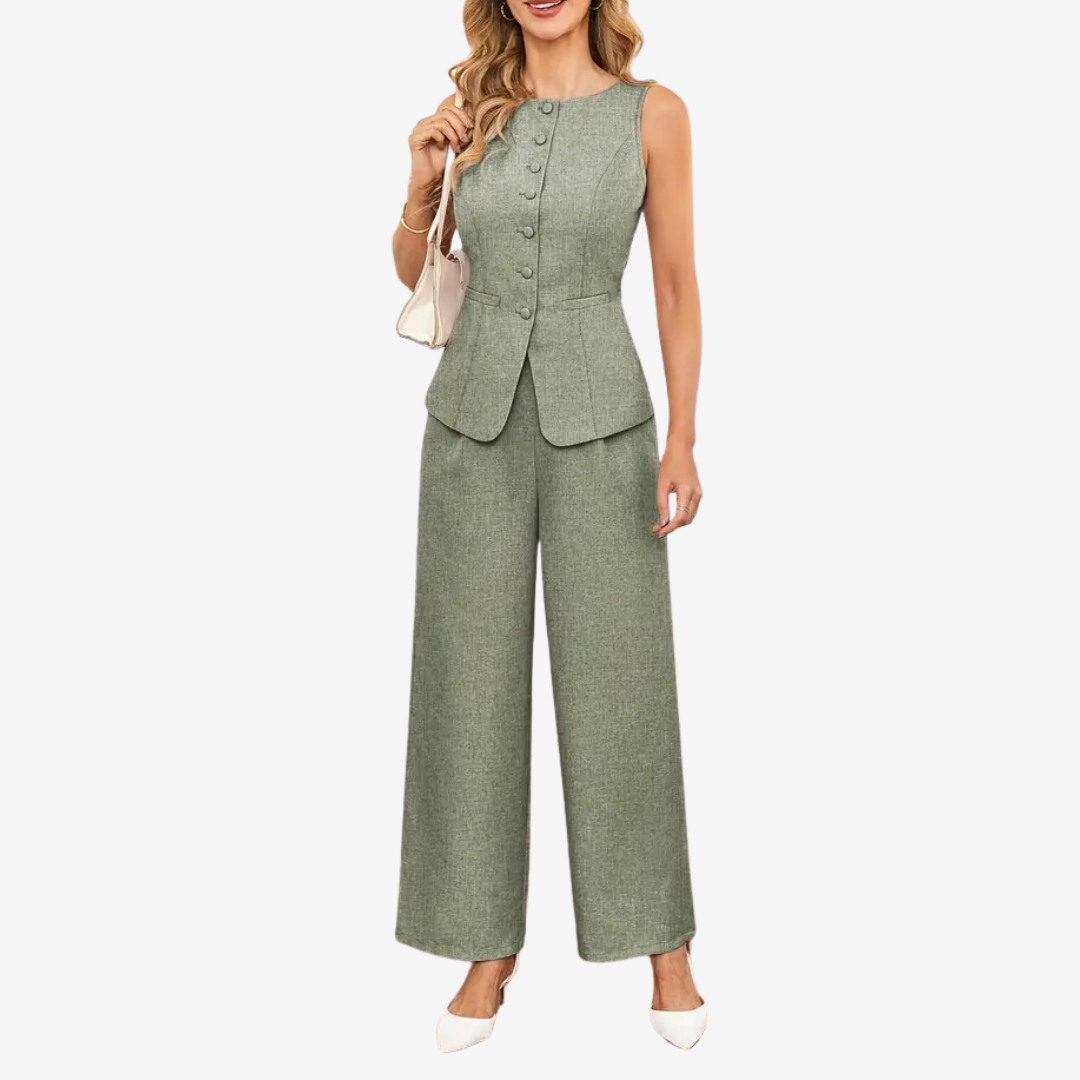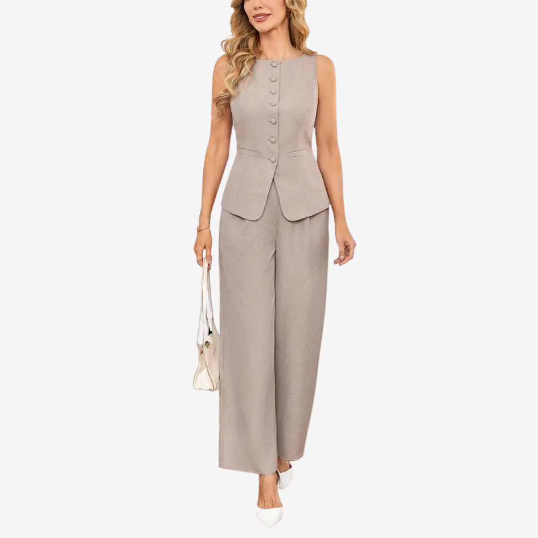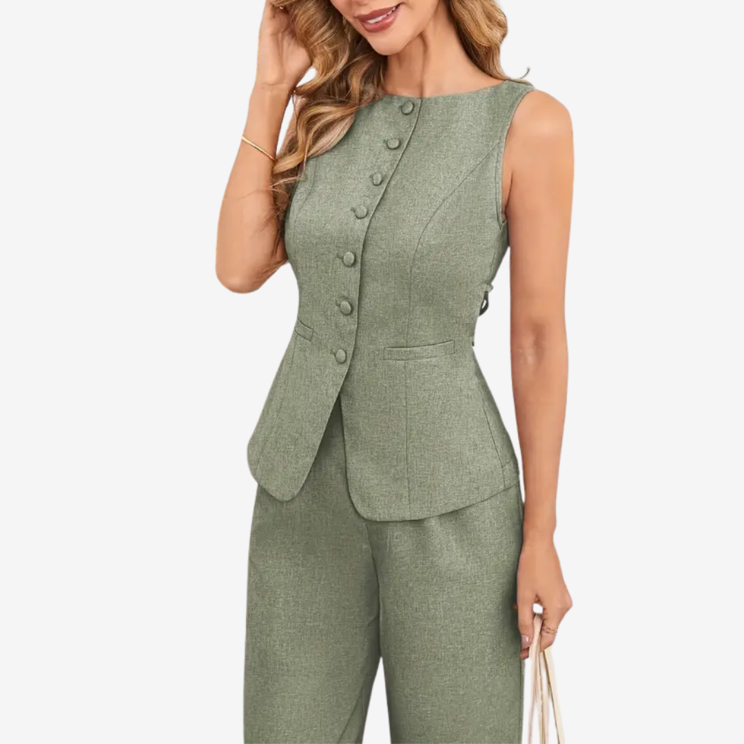 Arricchisci il tuo guardaroba con Aurélie™, un raffinato tailleur due pezzi pensato per le donne moderne che apprezzano struttura, stile e morbidezza. Questo completo è caratterizzato da un esclusivo gilet asimmetrico con bottoni, vita scolpita e taglio senza maniche che valorizza le spalle. Abbinato a pantaloni a gamba larga e vita alta, dalla vestibilità fluida ed elegante, si adatta con disinvoltura alla tua giornata e al tuo umore.