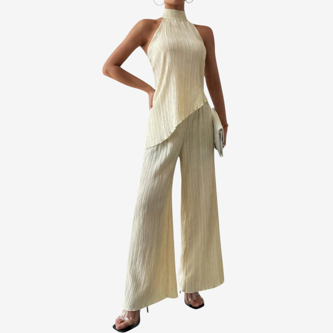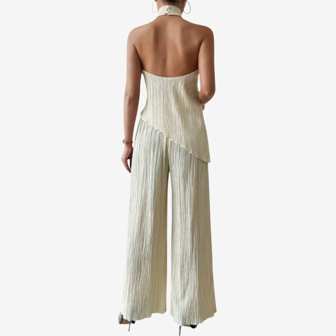 L'insieme Eléanna™ trasuda un'eleganza disinvolta. Un elegante top senza maniche con scollo all'americana abbinato a pantaloni ampi e a vita alta in un leggero tessuto crêpe color avorio crea una silhouette senza tempo. Il top presenta una scollatura drappeggiata e una schiena scoperta con delicate spalline regolabili per una vestibilità perfetta. I pantaloni presentano pieghe frontali pulite e una cintura sartoriale che accentua il punto vita allungando le gambe. Ideale per serate estive, abiti da invitata a un matrimonio o eventi raffinati, questo look bilancia con disinvoltura raffinatezza e comfort.