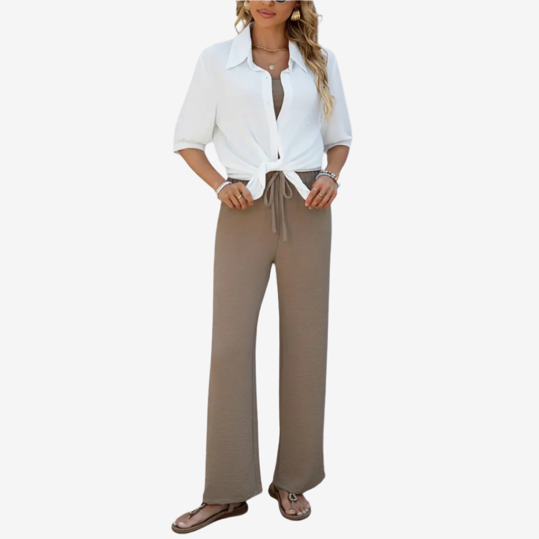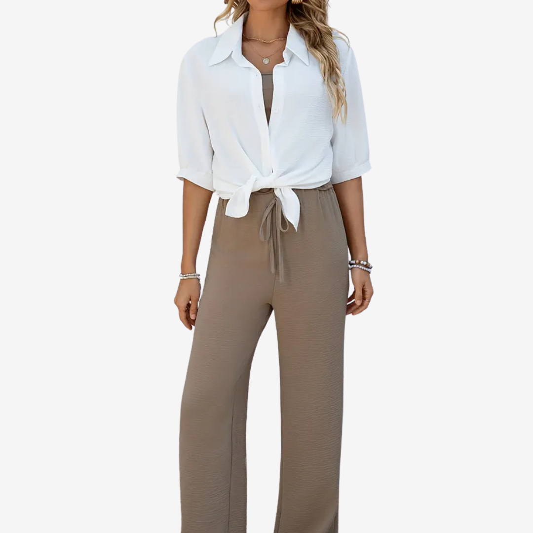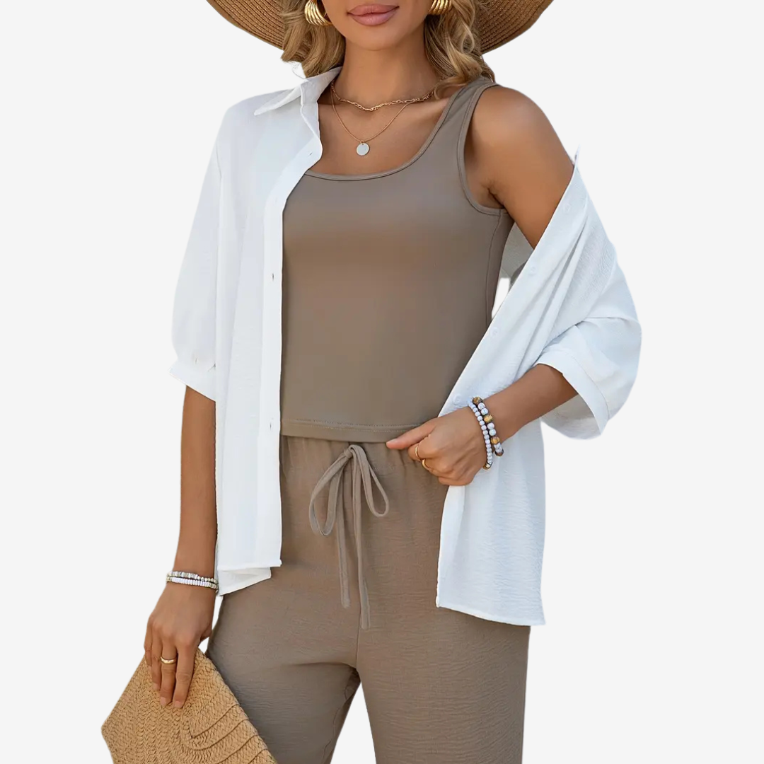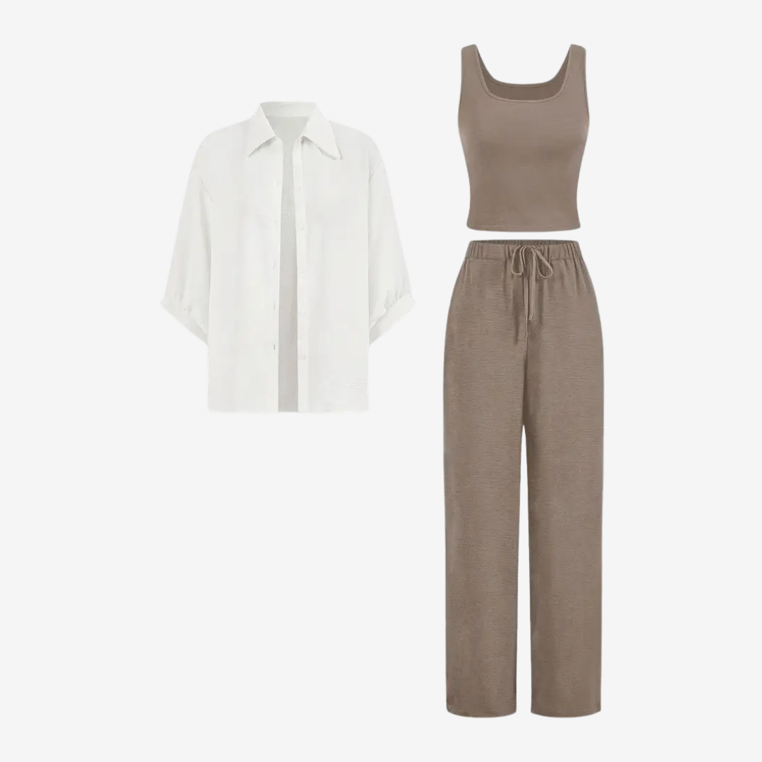 Arricchisci il tuo guardaroba stagionale con il set da 3 pezzi Auriane™. Questo versatile completo include una camicetta bianca, un top chic e pantaloni a gamba larga, offrendo molteplici opzioni di stile adatte a ogni occasione. Realizzato in tessuti leggeri e traspiranti, questo set assicura comfort ed eleganza durante i mesi più caldi.