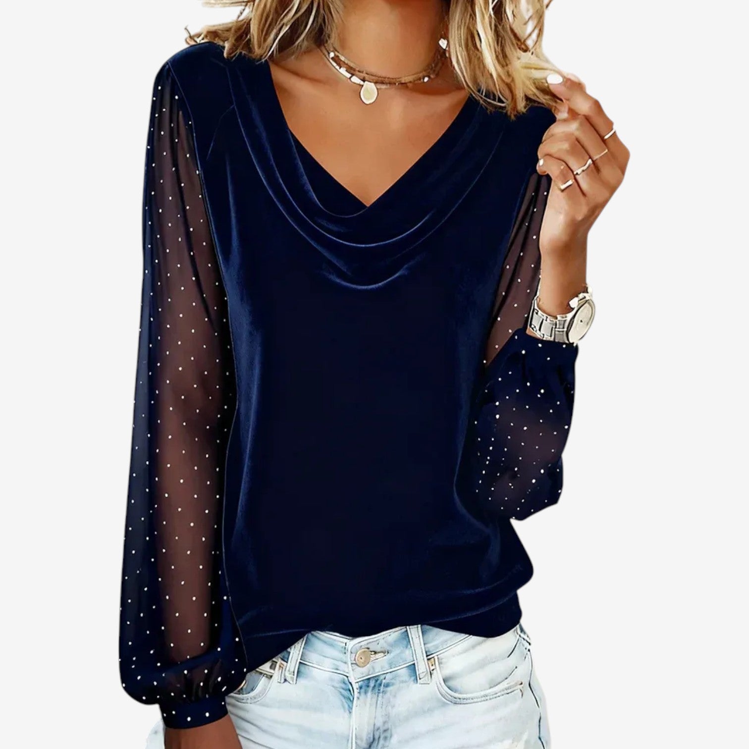 Una scollatura morbidamente drappeggiata cattura l'attenzione con la sua finitura raffinata e luminosa e le delicate maniche a contrasto. Il tessuto leggero scorre delicatamente sulla silhouette, mentre le maniche trasparenti a pois aggiungono consistenza e una sobria raffinatezza. L'equilibrio tra fluidità e dettagli crea una presenza femminile e aggraziata, naturalmente raffinata. La sua eleganza disinvolta si adatta perfettamente ai momenti rilassati del giorno e a uno stile serale raffinato.