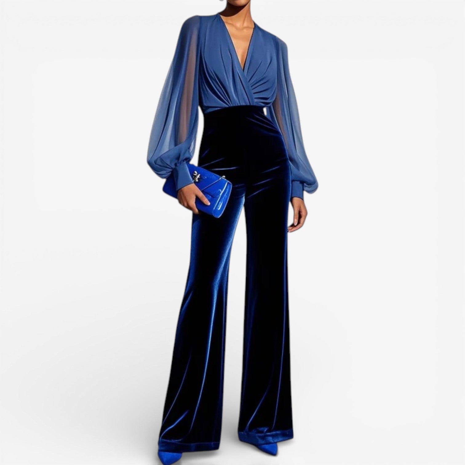 Questo sorprendente completo cattura immediatamente l'attenzione con il suo contrasto drammatico tra i lussuosi pantaloni in velluto profondo e le eteree maniche in chiffon trasparente. Realizzato con una combinazione di morbido velluto per i pantaloni aderenti e tessuto delicato per la blusa voluminosa, il capo offre una vita scolpita e un movimento fluido ed elegante. Il design evoca una sensazione di glamour potente e sofisticato, perfetto per distinguersi in qualsiasi evento serale. La sua versatile composizione elimina la necessità di coordinazioni complesse, offrendo una soluzione chic e disinvolta per qualsiasi occasione speciale.