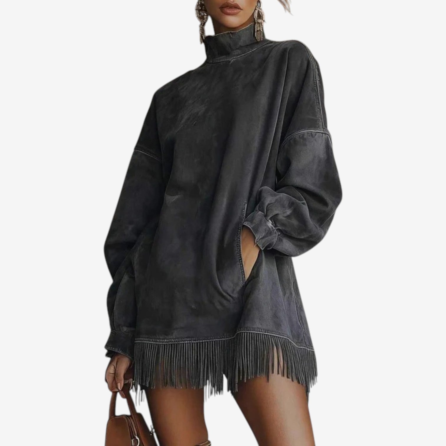 La silhouette distintiva di questo capo cattura immediatamente l'attenzione con la sua scollatura alta e il giocoso orlo con frange, offrendo un mix unico di stile casual e texture lussuosa. Realizzato in un pregiato tessuto effetto camoscio, l'abito presenta una vestibilità ampia e ampia e tasche funzionali, garantendo comfort senza compromettere un'estetica distintiva. Questo capo evoca una sensazione di sofisticatezza disinvolta e accogliente, perfetto per chi apprezza sia la comodità che un design espressivo ed elegante. La sua natura versatile gli permette di passare agevolmente da un look da giorno sofisticato a un look da sera rilassato.
