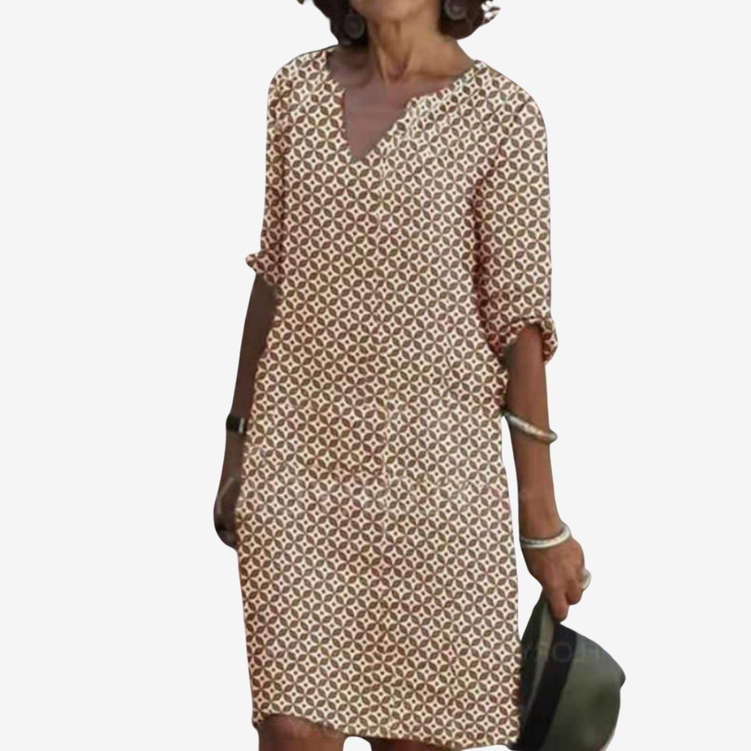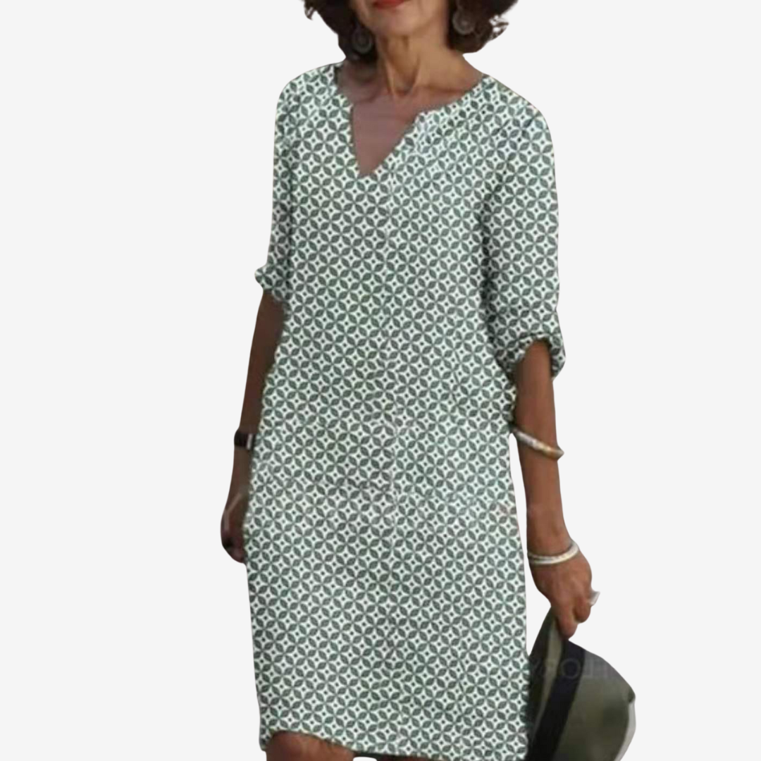 Sylvaine™ è un abito fresco e di media lunghezza, caratterizzato da una moderna stampa geometrica, perfetto per l'uso quotidiano con un tocco raffinato. Realizzato in un tessuto leggero e morbido, avvolge delicatamente la figura offrendo al contempo un comfort eccellente. Le maniche a tre quarti regolabili aggiungono un tocco di elegante versatilità. Che tu stia gustando un brunch informale, passeggiando per la città o andando a un evento estivo, Sylvaine™ si adatta senza sforzo.