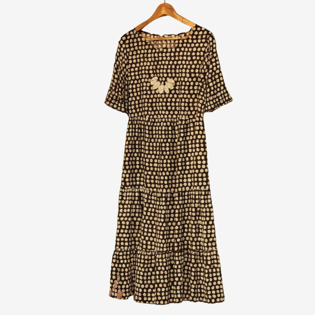 Immergiti nell'eleganza rilassata con Théa™, l'abito quotidiano per eccellenza, rivisitato con charme e comfort. Realizzato con una silhouette lusinghiera al ginocchio, questo capo combina una stampa vintage a quadretti con delicati ricami floreali per un tocco di campagna che incontra lo stile boho. Il taglio rilassato, le maniche corte e il drappeggio fluido lo rendono il capo perfetto per le giornate di sole e i momenti di relax.